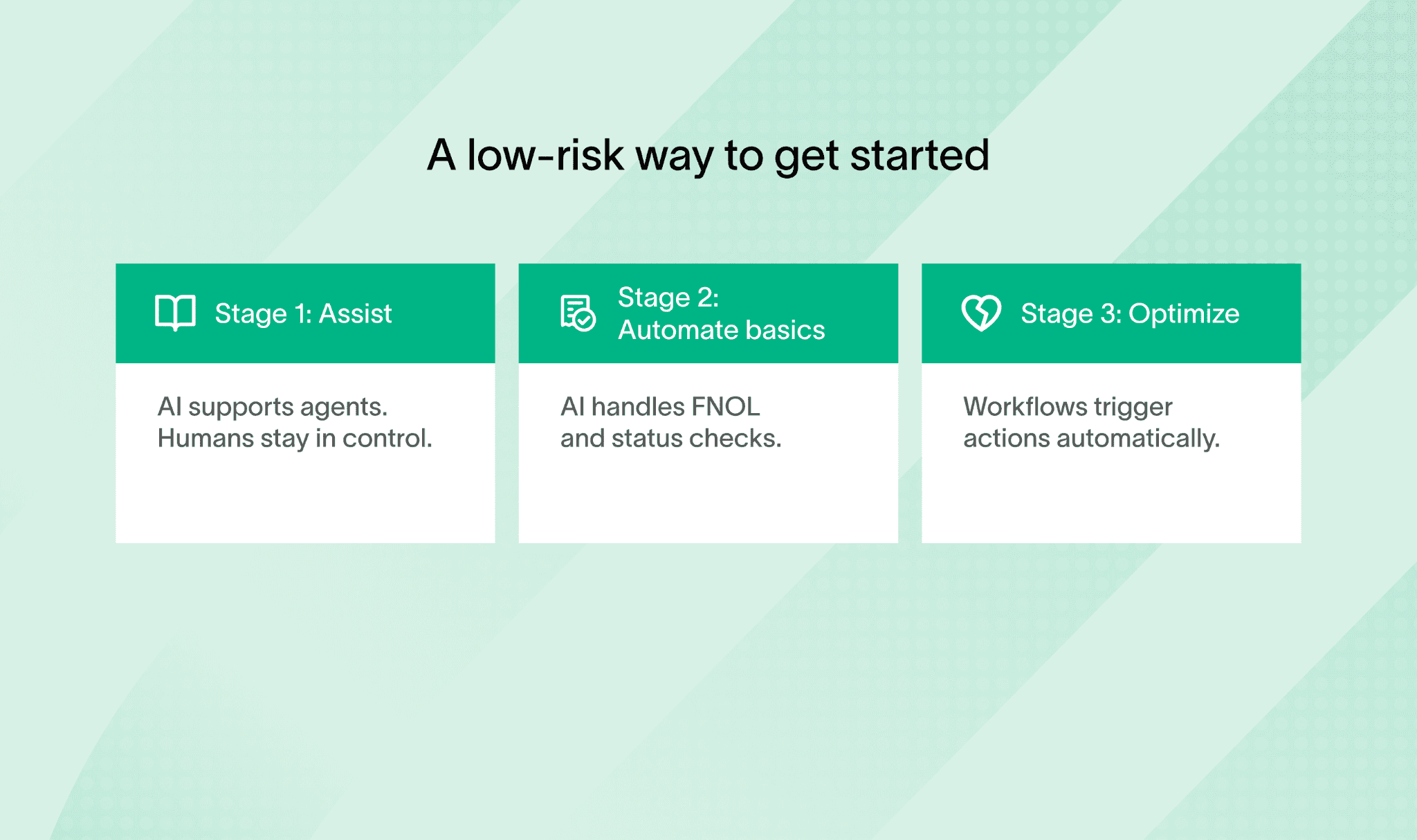 It’s smart to start small with a pilot. Focus on high-volume, repetitive tasks such as First Notice of Loss intake or claim status inquiries. These areas are rule-based and perfect for AI to show quick wins. You’ll collect valuable data to tweak and optimize the system.