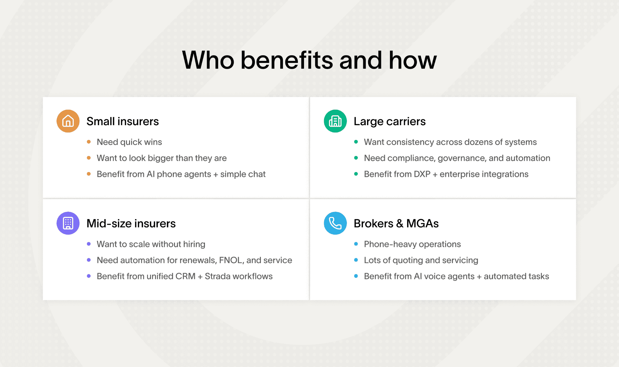 Look at case examples, for instance, a small insurer succeeding with Ensurite versus a large one deploying Salesforce plus Magnolia DXP and Strada AI to automate customer calls.