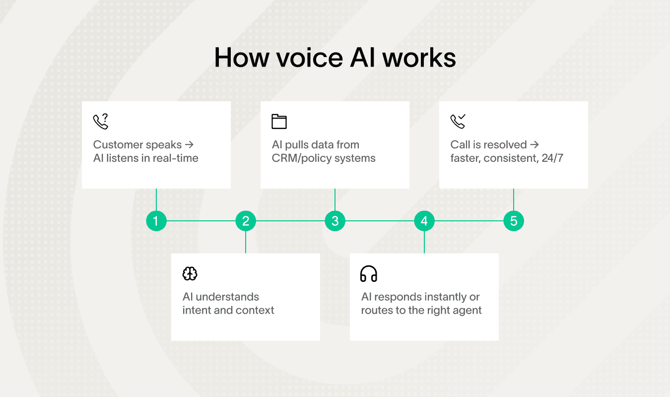 Voice AI changes that equation. By integrating directly with CRMs, policy systems, and knowledge bases, AI can personalize every interaction.
